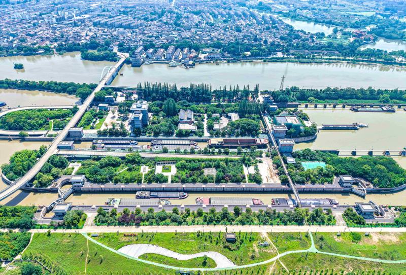 2025年7月4日,船舶有序通過(guò)京杭大運河揚州段邵伯船閘(無(wú)人機照片)。新華社發(fā)(任飛 攝)